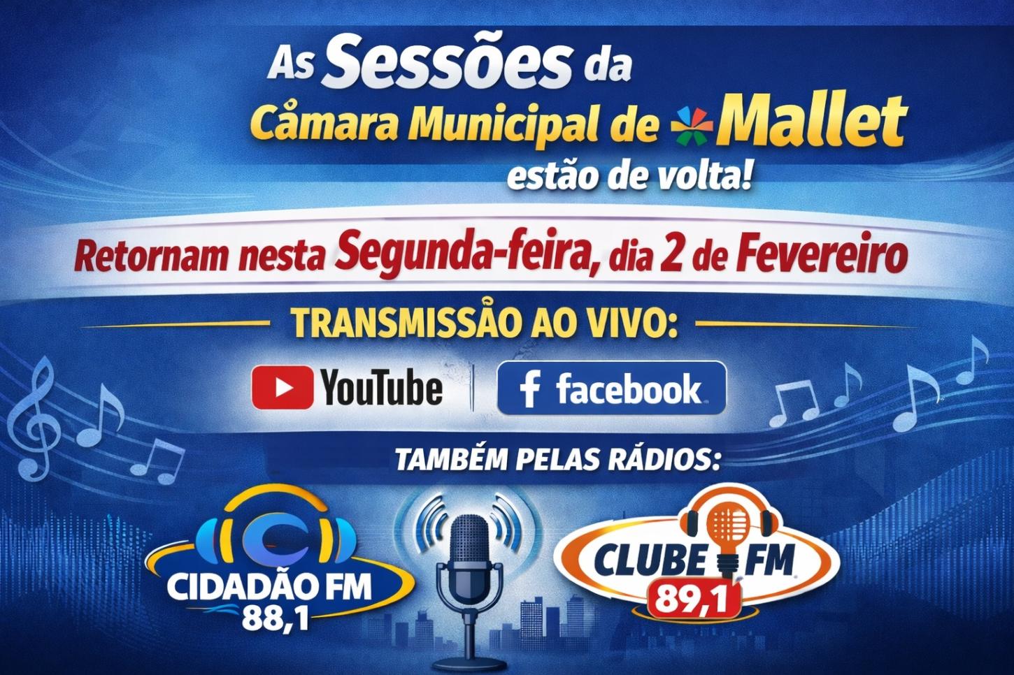 Mesmo antes do início oficial das sessões ordinárias, a Câmara de Mallet já esteve em funcionamento neste ano. Duas sessões extraordinárias foram realizadas em janeiro de 2026, quando vereadores se reuniram para analisar e deliberar sobre pautas consideradas urgentes e de interesse público.